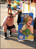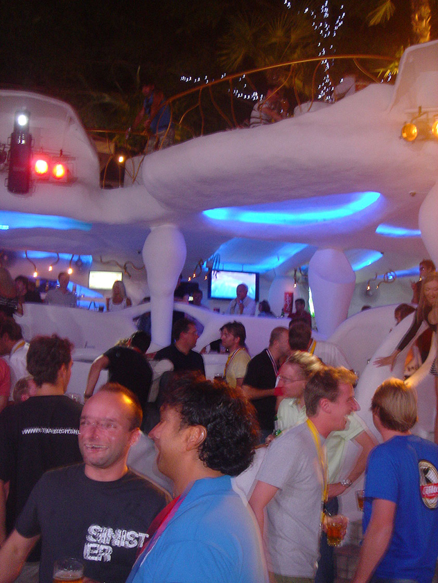 Fine. What follows is a long night in an oversized discotheque, with (to the great joy of the flagman) horny babes and (difficult, since drink vouchers are distributed that I, with my fortyish eyes, can hardly read, but which are sometimes intended to procure normal, yet sometimes distilled booze, always featuring multiple choices thereamongst) booze and music. Just prior to closing time a lady turns out to be interested in me. I think "Yeah wonderful, but I've got a ranking to achieve here, and it looks like Farid is about to collapse, so you can go fuck yourself.". She slinks off disappointedly.