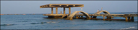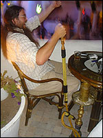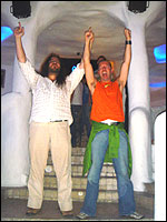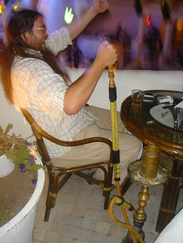 Yet few believe that the organizers are right, and the buzz is loud, all 'round the room. This, of course, doesn't matter, because the organizers, as organizers, are always right, even if they're not, and so they are now too. The organizers, following consultation of the drivers, decide that 1 winner needs to arise from the stalemate. And so it is decided there shall be a last-man-standing contest: both teams must appoint a 'designated drinker' and they must, until 1 rolls over, compete in Club Ibiza, that night, thus to decide who's the winner, of the Amsterdam-Odessa Rally. Tom and Martin are designated 'designated drinkers', but Tom then decides to cop out: he absolutely intends to go to the club, but also to just leave when he gets tired, because to him the finish flag at O'Neill's was the end of the race. An attitude I both support and applaud. And so when, sometime later, we leave for Club Ibiza, the mood once more is excellent. And it so remains, since Club Ibiza is da bomb. An open air disco constructed, in white plaster, in Dali-style on the Odessa beach, by the Black Sea, with a fine dancefloor, a pond (yes really), three stories, boxes and sitting areas everywhere, and... ...water pipes! Aad and I immediately order one (seems harmless to me, since I'm fairly sure I won't hit the bong again after this trip), with champagne below and cherry tobacco up top. And although I haven't, of course, smoked for some six years now, my body infallibly remembers what to do with it. So I experience an enormous nicotine kick, topped by a maniacal gigglish edge because of the champagne. Ground for great joy. Thusly intoxicated we have a great night, watching those dancing, and even dancing some ourselves. In between, Aad and I take time for some beach experience, and enjoy a good conversation on a pier jutting out into the Black Sea. On the way back to the Ibiza we see something dancing in the dark. It turns out to be a totally raving babuschka, enjoying the music that, in this no man's land between nightclubs, bursts from the Itaka discotheque, which is right next to the Ibiza. Party on grandma! At night's end, when leaving the Ibiza, an argument arises though, because the thievish staff pretends there is an unpaid bill (they attempt to prove this by way of a vague photocopy with two bills on it). Ed's bartering with them, when Pim Landman (of 'Always a surprise') catches wind of it and explodes. He insists that the money already paid by the rally organizers has already been pocketed by the club's staff. Which of course is true, but does not seem all that relevant to me, so I try to calm him. His outpour of anger does, though, lead to a confession on the part of the thievish staff that said leftover bill, said to not have been paid, has never been - in the end, they turn out to only want tip. Which Edwin then pays, together with Pim and Scott (of the 'Insurance Racers'), to end the argument.