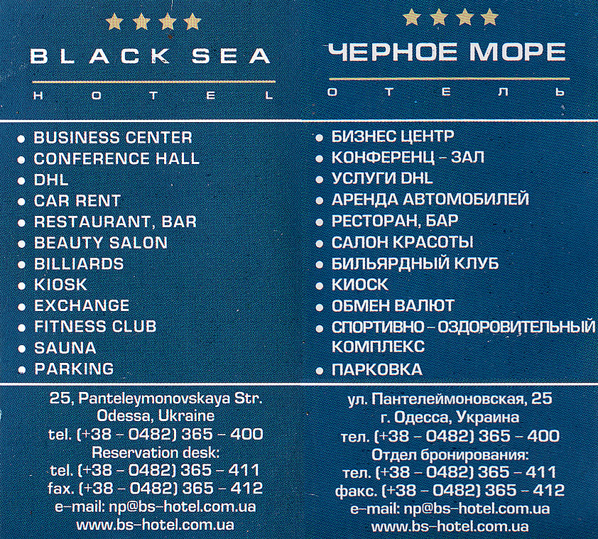 Day 6 08.29.2007: Odessa The next morning I have breakfast in the Black Sea Hotel, for the first time. Should have done that before! I discover, unbelievably, oatmeal porridge, really! Healthiness, among all the unhealthiness, very good. There will be more of it, today, since I decide to, after breakfast (which I, by the by, enjoy together with Ed and Hans Beckers of 'The Mitsu strikes back' - the table talk mainly concerns the gigantic rift between rich and poor in this country), take myself to task in the fitness studio the hotel, according to Edwin, sports: he namely saw it mentioned in cyrillic on the sign beside the elevator in the basement (it isn't mentioned anywhere else, not even in the leaflets in our room). But it exists indeed: around the corner, on the 7th floor, next to the exchange counter established at reception, is the fitness studio, and I am warmly welcomed there by trainer Andrej, who patiently explains that fitness costs 25 greebee, being coached by him another 14 greebee, and the sauna 40 greebee. The greebee stands at 6,1 per euro, so I think it's peachy keen. Andrej completely takes me apart in two hours, then blandly asks: "Say, how long ago is it that you last worked out?" "A year", I groan. "OH! Well, THEN this is enough." Yeah right! Anyway. I pleasantly cool down in the sauna, then totter back to our hotel room. At the reception desk I run into 'Great Balls of Fire', who provide me with the phone number of a Landroverdealer (who's just repaired their Landrover), so we can bug him for the phone number and/or address of an Opeldealer, so we can replace our mirror-gone-gone-in-Poland and some other stuff (the Combo, we noted down in the hotel garage, leaks a tiny bit of diesel, the claxon no longer works and the hood no longer opens - bit of a nuisance if you want to check damage and fluids).