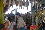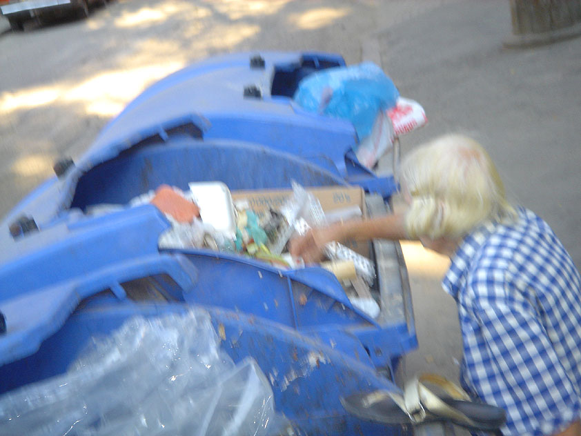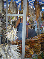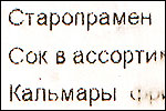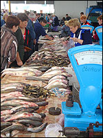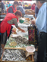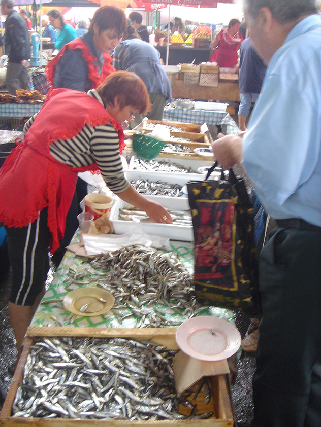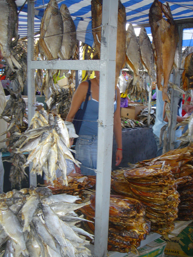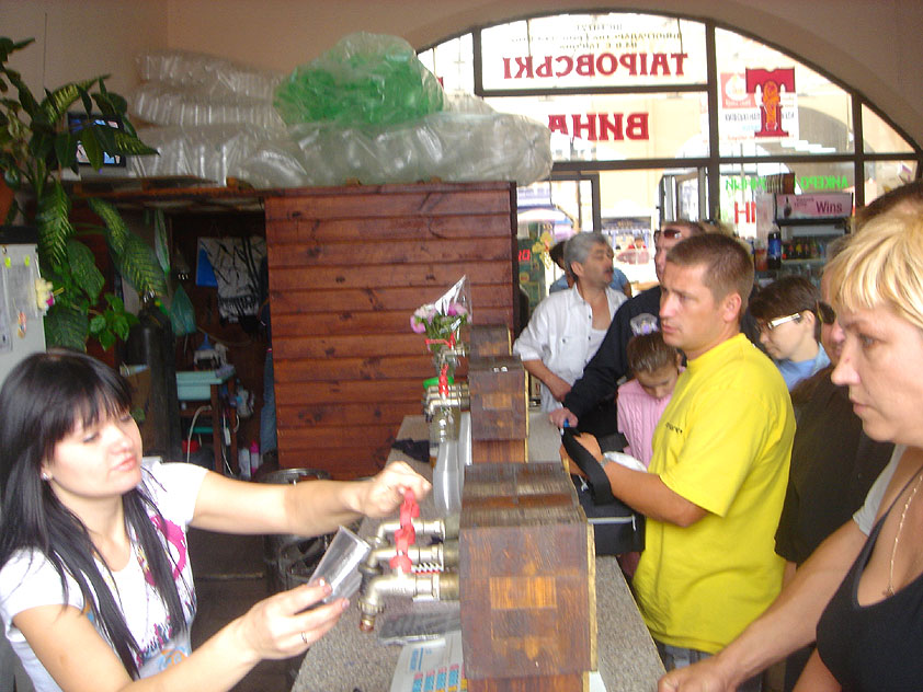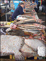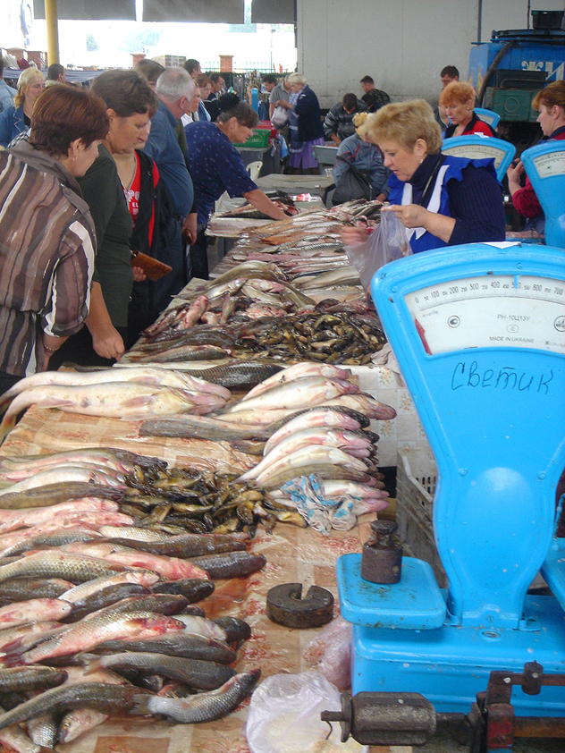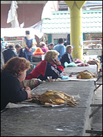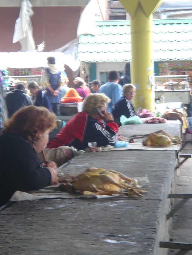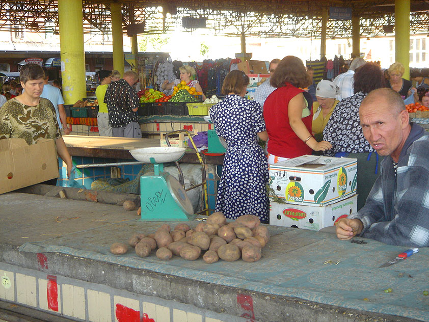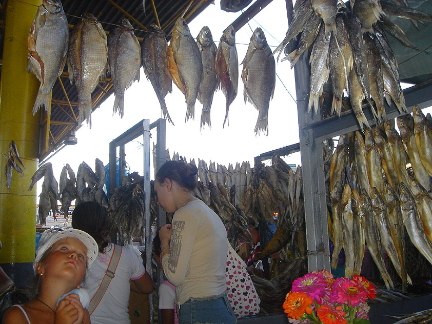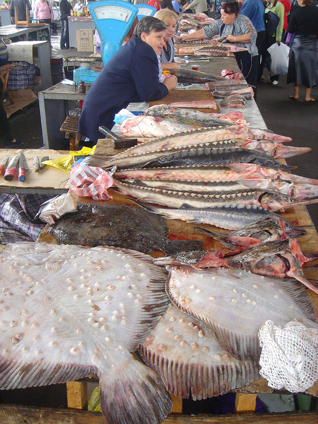 In the part with the dead fish we are struck by the enormous diversity. There are more species here than I ever saw in Holland, but no shark. My kind of sea, that Black one. What also stands out is the enormous amount of silverfish. Irregular too, in the Rhine delta: I mostly know these fishies from a drawing, way back, in a beautifully illustrated book with French rhymes ('Sur le pont d'Avignon' and the like). We also buy sausages (tasty!) and chocolate (lovely stall with big boxes, 1 among them with photoes of Odessa on it). In the meat department we marvel at the ladies waiting there with just 1 dead bird, until they sell it so they can go home again: quite normal here. In the vegetables and fruit corner there are people like that too, sometimes with some 10 potatoes, or a heap of mouldy mandarins, as the only goods to sell. At the close of our shopping spree I have a large one-and-a-half litre softdrink bottle filled with Odessian red wine at a wine store behind the hotel. Nice! It turns out, upon testing that day, to be undrinkable, but when I reopen it at home, later on, its taste has dramatically improved. Ripewine. You learn every day.