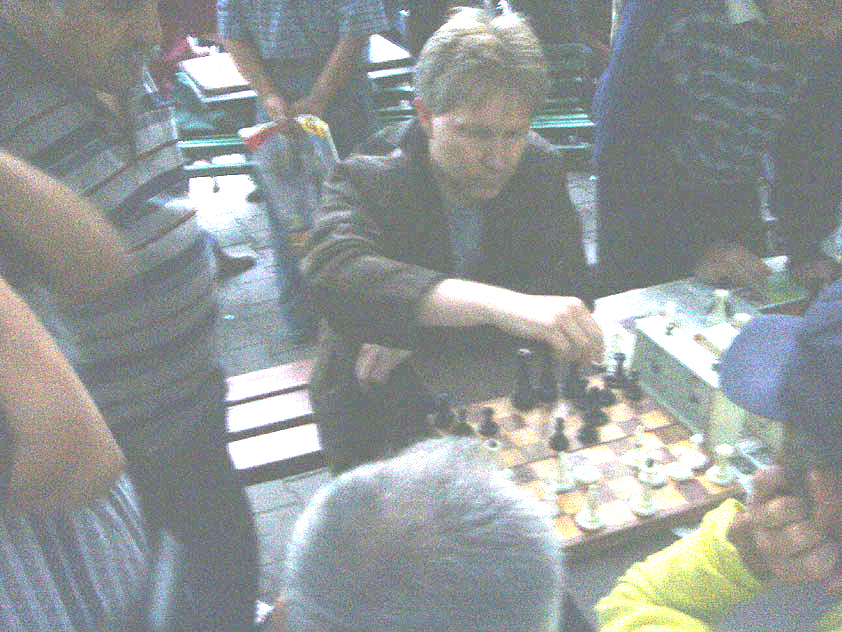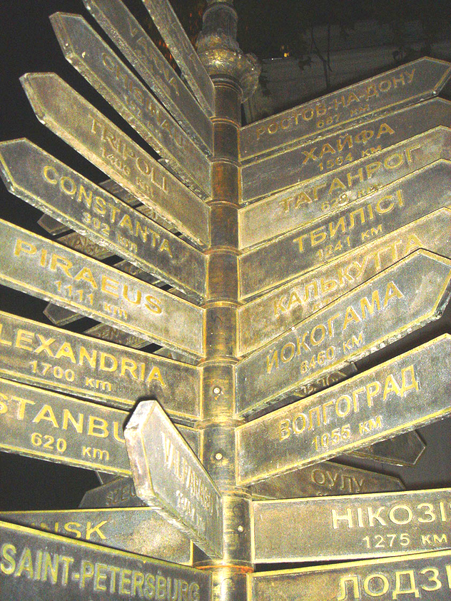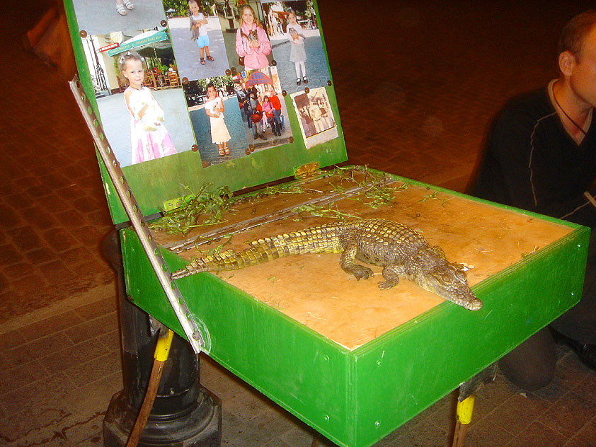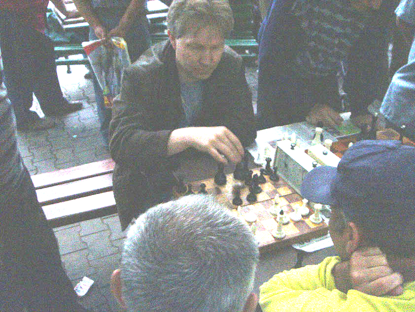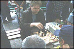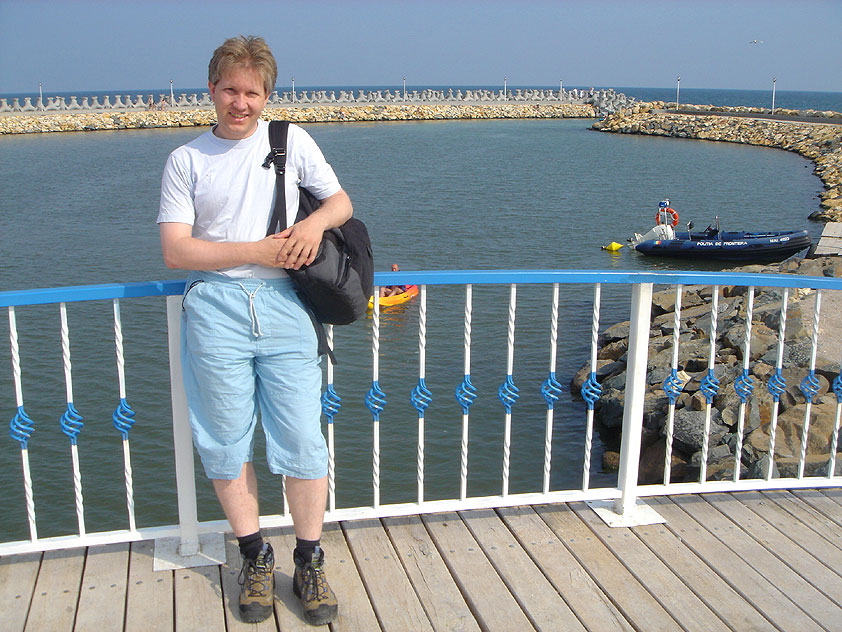 In a park further down I buy a beautiful handpainted matruschka (one of those dolls with a smaller doll in it with a smaller doll in it and so on; this one's expensive, but way prettier than the machine painted ones at the other stands) for my pregnant sister. In the twilight of dusk, Ed plays a few games of chess with some older gentlemen, who do this daily, under a shelter especially built for it, and so cut him to pieces. I'm invited to play a game of checkers, but I stay away from a fruitless endeavour - I'd rather stick to taking Ed's picture, and listening to and talking with the men. In the evening we have fairly cheap pizza in an Italian restaurant (with a nice waitress, even though she misses some fingers on 1 hand, and strange digital pictures, pixellishly enlarged, of Venice-in-the-rain on the wall) in a vague suburb, while in the distance big fireworks go bang: it's a public holiday, because Odessa turns 100 today. We watch it from afar, before we return to the hotel. Day 9 09.01.2007: Odessa Today we have street breakfast, with puff pastry snacks and outdoor coffee-from-the-machine (yuck, sugar - good that I first procured an espresso at the hotel bar). After, we decide to, before we leave, do some shopping, in the market place. This is easy, since it's right behind the hotel. We go from suprise to surprise there. In the section with the clothes and accessories we find the uniformity striking: stall after stall with the same shoes, jeans, shirts and belts. But Ed does find a rather unique and cute cap, for his girlfriend Saloua.