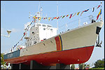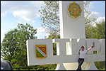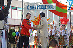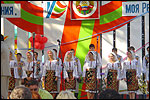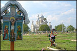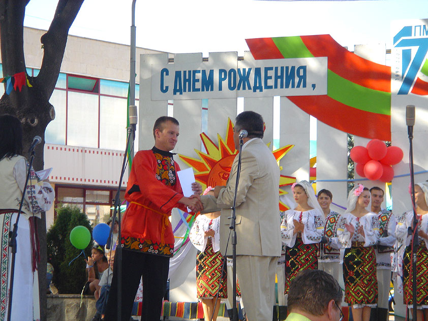 And although we're there only briefly, we do take in some of the etraordinary status of this country: at one of the horseshoeshaped parties they've put exhibitory boards up, out in the street, the kind we know from libraries and museums: large and rectangular, with pictures and text. They describe the struggle for independence and, on them, we see men with kalashnikovs, running through trenches. 1992? Brrr. That's close. And it gets closer yet. Because as we walk back, having bought some food and drink at a shop at the turning point (I have a cream horn there, for the first time since my early youth, but the ice tea's more important, 'cause it's bloody hot, in Tiraspol, today), we see that one of the horseshoeshaped parties on this side of the street is hermetically sealed off to the public. It is peopled by expensive men in suits, and guarded by types too large for their black twopiece, with earpieces in and crewcut hairdos of the Spetznaz type. Most probably, this is the arms dealers partying with the president. We act like we don't notice, but I am quizzically studied by the earpieces, who stare estranged at my own earpiece in particular (it's the Jabra BT250v bluetooth headset for my phone - what do they know). Ed buys some barbecued meat further on, of which I partake a little (not too much, doesn't fit beside the cream horn), and then we walk back to the car.