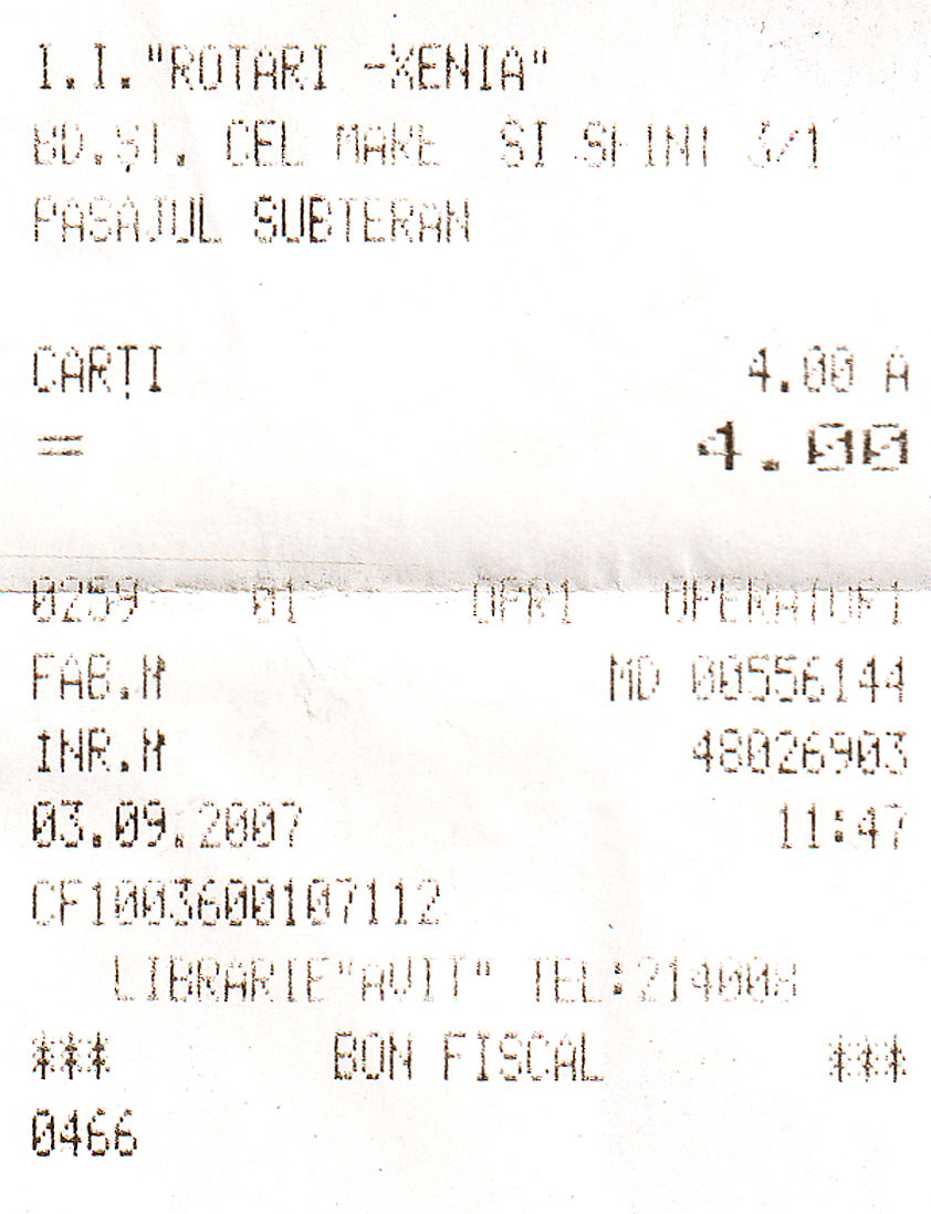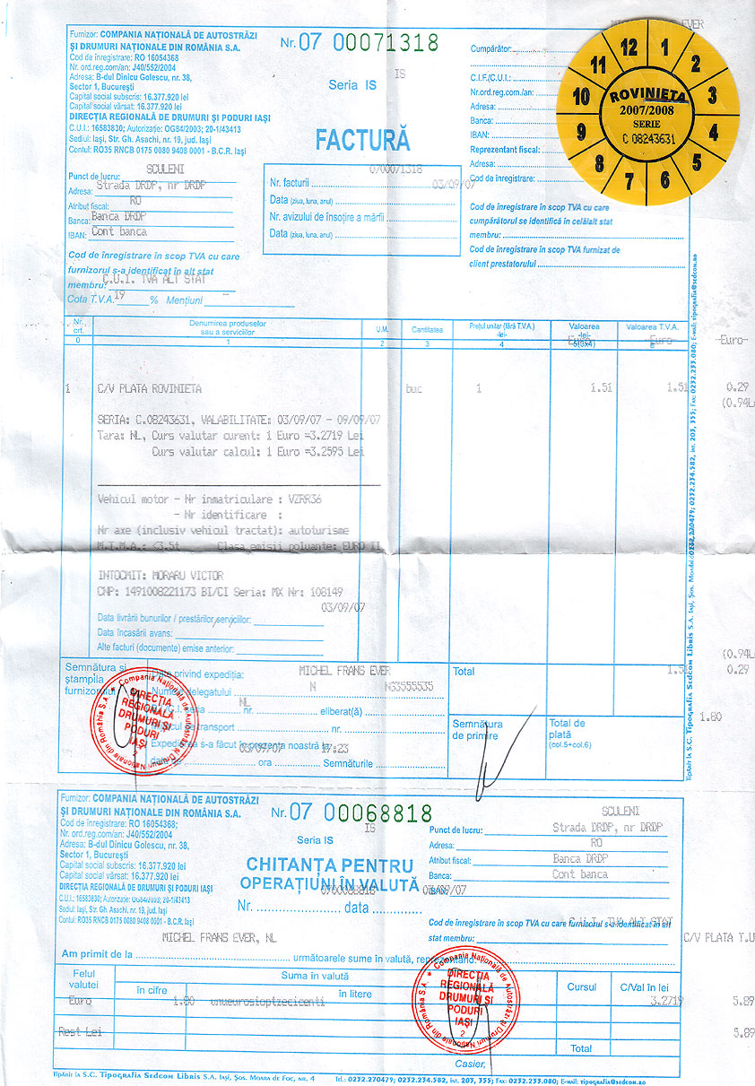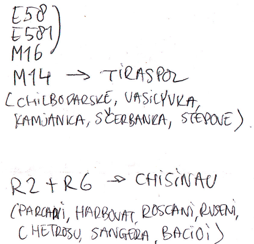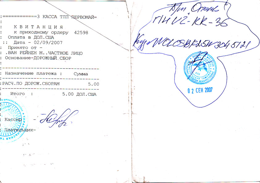 The customs officer checking our passports (I now understand this is the construct at all borders in this part of the world: you first get one who checks your papers, and then one who checks your car - it was even like that in Przemyśl, but we didn't notice it there because, probably because of the consulary effort, they came together) is obviously making up something he can use as a reason to take some money from us, when we ask: "Can we buy that flag?". He looks at us befuddled. "But that's my national symbol!" "Precisely, that's why we want it!" Now I see three things in his eyes. That we can do no wrong no more. Dollar signs. And the realization that he won't be allowed to sell that flag. But he tries anyway. He walks from the booth, to the other side of the road, and up the stairs into the office, and his boss. Who throws a fit of laughter, but does tell him off in Transnistrian. Whether he's lost his mind, probably. He returns dejected. We cannot buy the flag, but we may drive on without paying him. This, we feel sorry about for him: so we hand him a pack of leftover Ukrainian greebees and drive ten yards further up, to the car-apart-taker. And we woo him too. Nothing gets unpacked, because we whip out a print of the Wikipedia-info on Tiraspol (prior to our journey, I have printed that info on all the cities we thought we would go by, to read in the car). The guy loves it and is very happy with it: we can drive on. He does first ask us how much we paid for the two visa, on the other side of Transnistria. And we are foolish enough to actually tell him. From now on, he will ask for €20,- too, for them. Their way to control pricing, apparently. On the Moldovan side of the border we are stopped again, this time by a jolly and mustachioed customs official, who doesn't ask us anything, but immediately commands us inside, where he elaborately produces a stamped and signed green paper for us and presents it to us with a triumphant smile. We evidently are to be overjoyed to receive it. It costs seven dollars.
