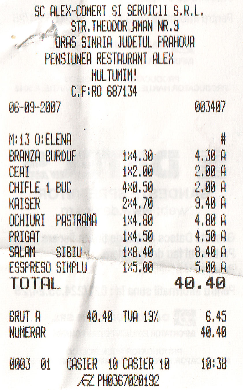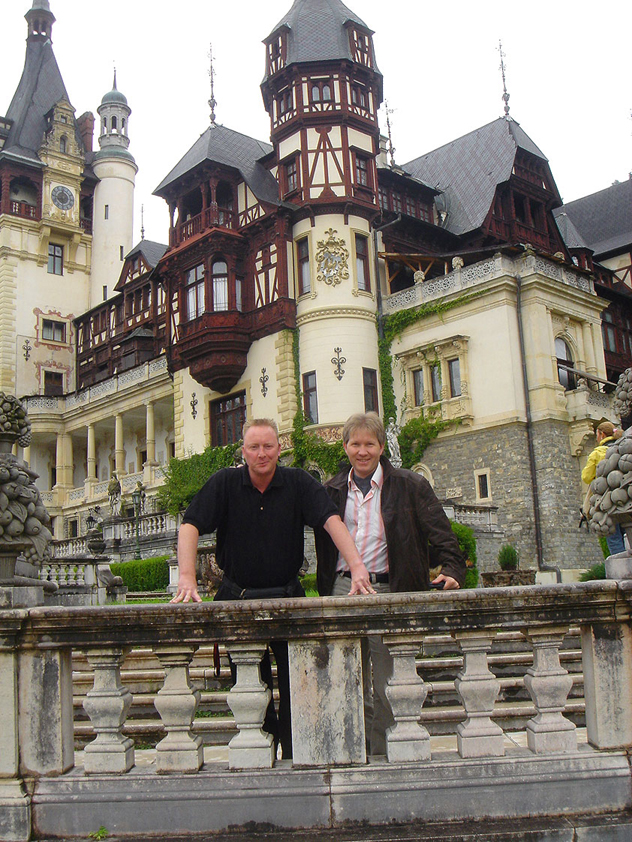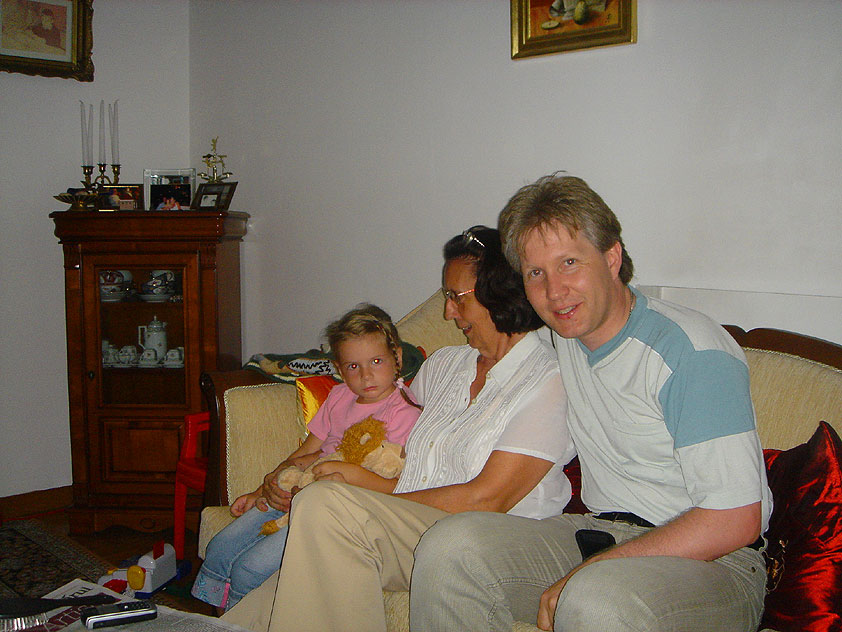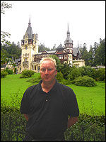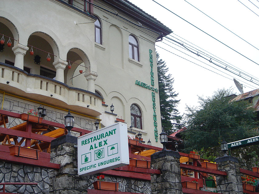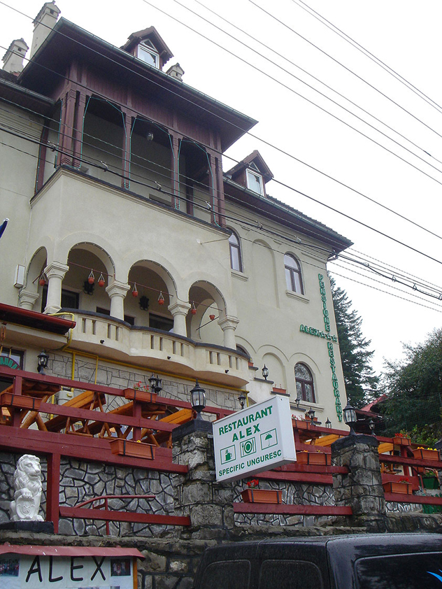 The boulevard runs into Ceauşescu's palace, and it, indeed, as stories about it say, is an utterly megalomaniac thing, constructed at the expense of the people. We do not venture into it, since there's too much we have to do today, but walk back parallel to the boulevard where, behind it, we find some leftover beautiful old houses and an old church surrounded by total ugliness (that's what, according to Ed, Ceauşescu did throughout Rumania, rather than demolishing them, he boxed in churches with ugly communist blocks, until they disappeared out of sight). Then we drive to the home of Claudio's mother, or rather, the homes of Claudio, Gaby and their mother. They're three, namely, large, square and detached, standing next to eachother on a plot of land some 40 by 333 yards large (with, of course, a fence around it), that Claudio once bought for a song and now is worth a fortune, despite the fact that it's situated right below the flight corridor for the smaller Bukarest airport. Along the way we drive by an Opel-dealer, where we therefore stop in hopes of mirror. Alas: two weeks delivery time. But it's coming down! I voice the expectation that we'll find it in stock in Germany, just before the Dutch border. Claudio's mother relieves us warmly (as does Ice, the husky-with-three-kids). She feeds us large quantities of pilav-with-chicken-and-paprika, feta-like-cheese, beer and Snickers-ice cream. We watch tv together with Claudio's mother in law, and her granddaughter (Gaby's daughter). On the news, we see that along the road leading from Iaşi to Constanza, more particularly in the Galazi region, everything's been washed away by enormous floods, that have done great damage in Moldova too. We seem to have made a clean but narrow escape. In the northwest of the country, meanhwile, a tornado is wreaking havoc, we learn. Way to go not! Before we leave, we talk to Gaby, just returned from work, and look around the other two houses. Then we drive towards the Carpatians, and to Sinaia. It's a mountain resort in the heart of Dracula country. We can hardly make it out, because it's dark and raining hard, but we notice we're in the mountains, since the road towards it juts upward sharply and it's full of S-bends, the temperature is dropping fast, and the air's a lot fresher. The town is packed with hotels, but we keep going up the mountain, under the false impression that higher up, hotels will be cheaper. This turns out to be the other way 'round: the hotels up top are much more expensive, because the locals assume that, if you end up there, you've already fruitlessly tried all lower ones, and will therefore be willing to lay down more money. We are, on the other hand, experiencing a wonderful bit of touristic route. We make our first try at Hotel Intim. That doesn't just sound wonderfully wrong, it IS: it's a 1-star hotel (that's proudly marked beside it, on a sign), that looks like the ghost villa from the Scooby Doo cartoons, and inside is exactly what you'd expect of a hotel in the Carpatians: creaking floorboards, long hallway, painting on the wall of a Transsylvanian ghostcastle-with-just-1-lit-window on it and bats around it, and a dusty counter at the far end of the hallway, with a bent, dusty, little man with a moustache and suspicious glance behind it. Does he have any free rooms. "No." That's all, folks. Pity! We drive on and end up in Hotel Alex, indicated everywhere wildly. It turns out to be a thieving mob. €50,-, for a double room consisting of four spaces: a narrow hallway, a bedroom, a small sitting room, and a toilet-shower combination. That sounds roomy, but everything's unnervingly low and narrow, the toilet runs permanently, the shower cabin is lurching to the side, and everything looks like it's in dire need of renovation. We are, nonetheless, so wasted that for today we don't give a hoot: time to sleep. Day 14 09.06.2007: Sinaia-Vorderhornbach The next morning I must, to reach the breakfast hall, move around the front of the building on the outside. This has advantages, because it's a real mountain morning: slightly humid, but fresh above all, with typical clear morning air, and this low mountain range before me is beautiful to behold, in the morning mist. Breakfast turns out to not be included in the price. Thieves. Then, I make matters worse by misunderstanding the menu. I interpret 'kaiser' as kaiserbrötchen, and order two. "Two rolls", I add to make certain. I further order some local cheese and sausage. What the little girl in pornographically sound traditional dress then brings me is 1 portion of cheese, and 2 portions of sausage, 1 of which enormous: that namely is the double portion of kaiser, I later deduce, from the bill. She also puts 4 rolls down - 'cause there are 2 in every portion, and she understood I asked for '2 bread'. Okay, my own fault, but I can't help thinking that there would have been less problems had the menu been more clear and the staff more linguistically educated. I have Ed, upon his arrival at the table, therefore make use of my sandwich filling, saves money after all. Oh well. We didn't wake with bitemarks in our necks, which is worth a lot. Then we make our getaway, to go and admire the palace of Rumania's first king, around the corner. Beautiful! And I'm saying that without us having been inside (given the horde of people waiting to take the tour, we don't think that's a pleasant plan, and we do think it'd be too time-consuming). It is a fairytale hunting castle, but most modest for a king. I decide to move to the toilet, when it appears along the road to the parking lot down the hill. There's a cleaning lady there to whom I hand some money. She hands me two sheets of toilet paper and points to the men's block. There, I discover that the bog is a French hole in the ground. I throw the two sheets in and walk out again. Shit. By the parking lot, there's a Bastion hotel. Better! I walk in and ask: "Do you have a toilet?" "No, sir." "No?" "On