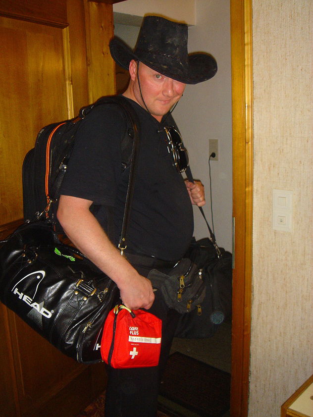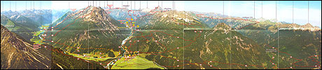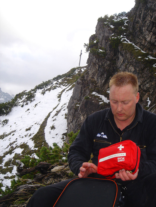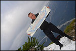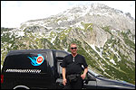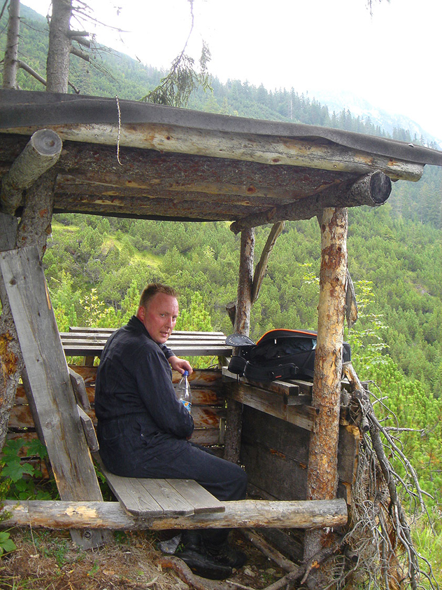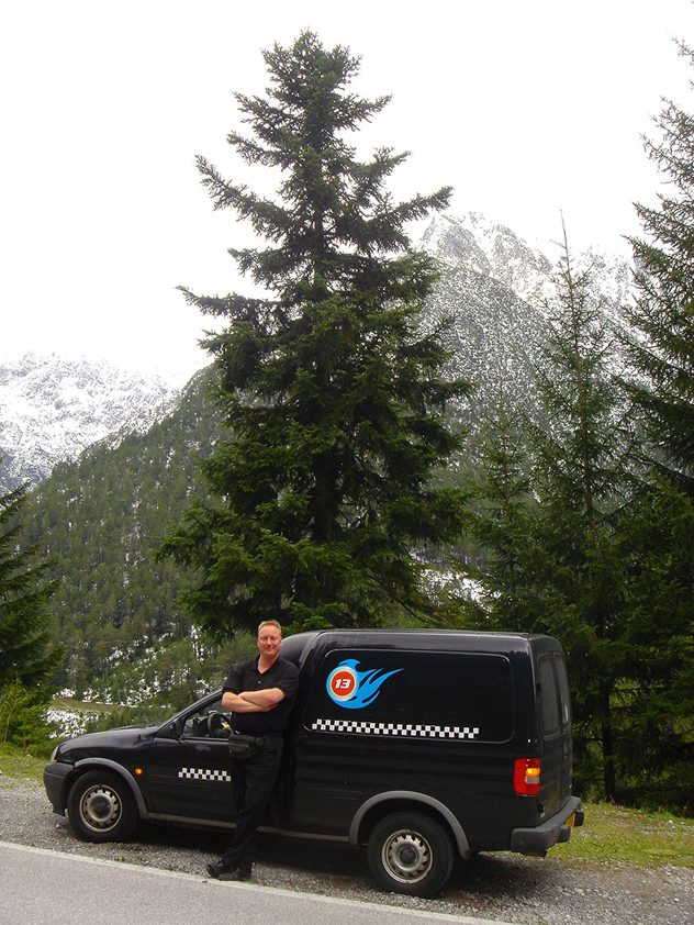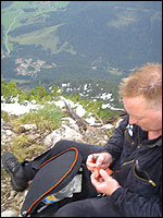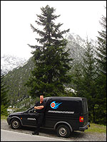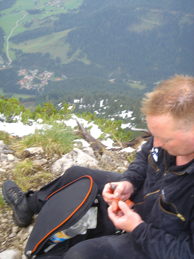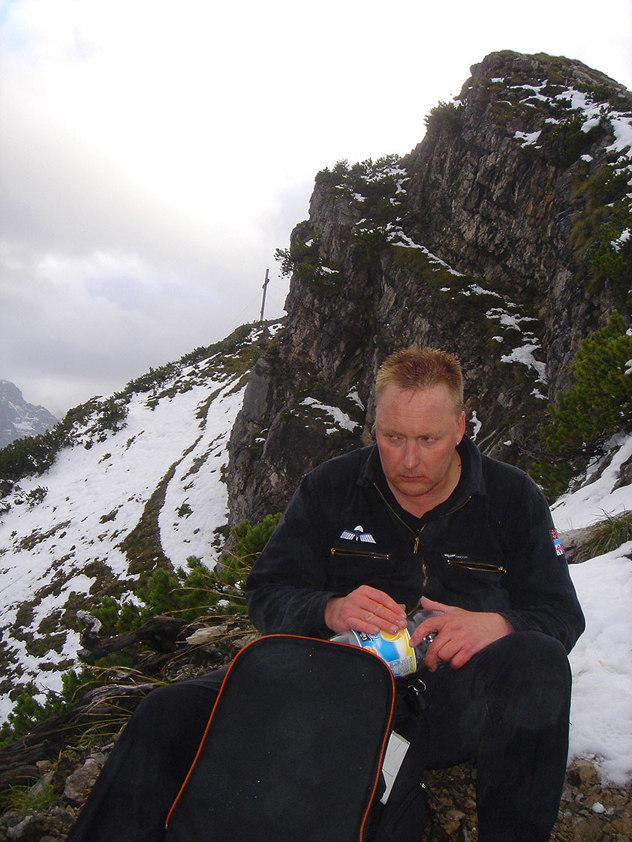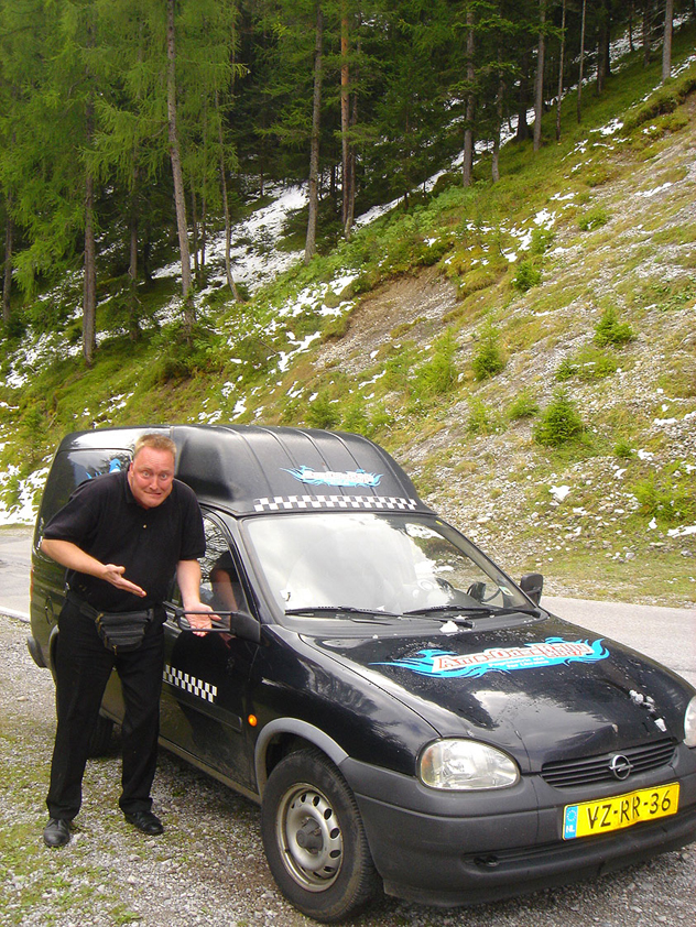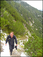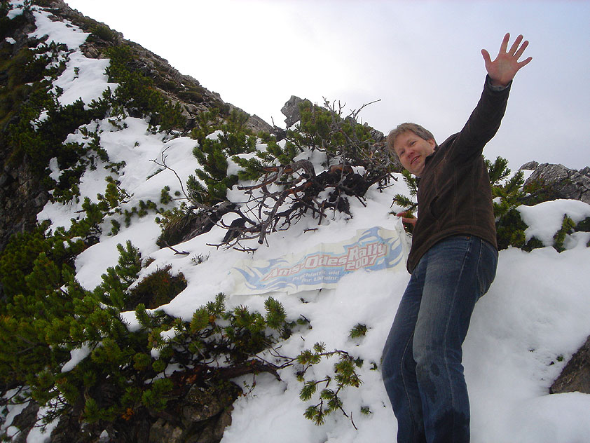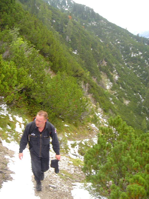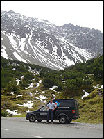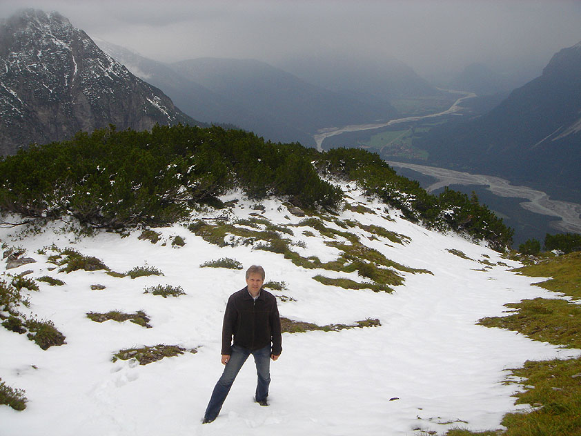 Just like driving. They can learn that from the Germans, in Holland. See, Germans really are the most civilized drivers in Europe. They drive like my driving instructor, but fast. That's how it should be! But it would be nice if they elongated those turnoffs off their magnificent autobahns a bit. Even in an Opel Combo they regularly produce near-death experiences. Somewhat further up we drive into Austria again. Austria again? Austria again. We namely have been en route, for by now the past 25 hours, to my childhood memory. They tell me one should never return to places formerly visited, because it can only lead to letdown. I shall belie that contention: I return, to Vorderhornbach. It is a small farming hamlet, and it's situated, near Reutte, at the edge of the Lechtal. Not on the side where Her Majesty the Queen of the Netherlands, her family and half the world tend to ski, but on the non-tourist other one, in the Allgäuer Alps. I've been there twice earlier, in 1983 and 1984. So I was 17 and 18 years old at the time. And on a school trip. Twice, for a week, we were kicked out of our beds every morning, in Vorderhornbach, in a Belgian holiday home, to march up a mountain with our severely hangovered heads from 7 in the morning until abouts 3 in the afternoon, then down again. Both trips left an unforgettable impression on me, and they at least partly made me who I am. And I had long been of a mind to, as soon as I'd buy a car, first drive it to Vorderhornbach to climb the Grubachspitze anew - but this didn't come to pass, since between dream and reality lies complexity. So now that the chance arises after all, I must go. Ed, thankfully, is not the most difficult of men, so agreed to the plan in Constanza already. Day 15 09.07.2007: Vorderhornbach Now that TomTom sends us off the highway, and high into the mountains, on the climbing road from Imst to the Lechtal, great triumph takes hold of me. It also envelops Ed: but this is more because we turn out to drive the Combo into snow. We pull over in elation, and proceed to throw snowballs at eachother! What wonderful contrast, to the 100 degrees on the beach in Constanza!