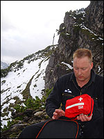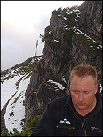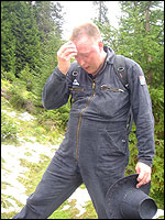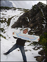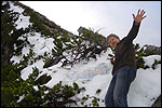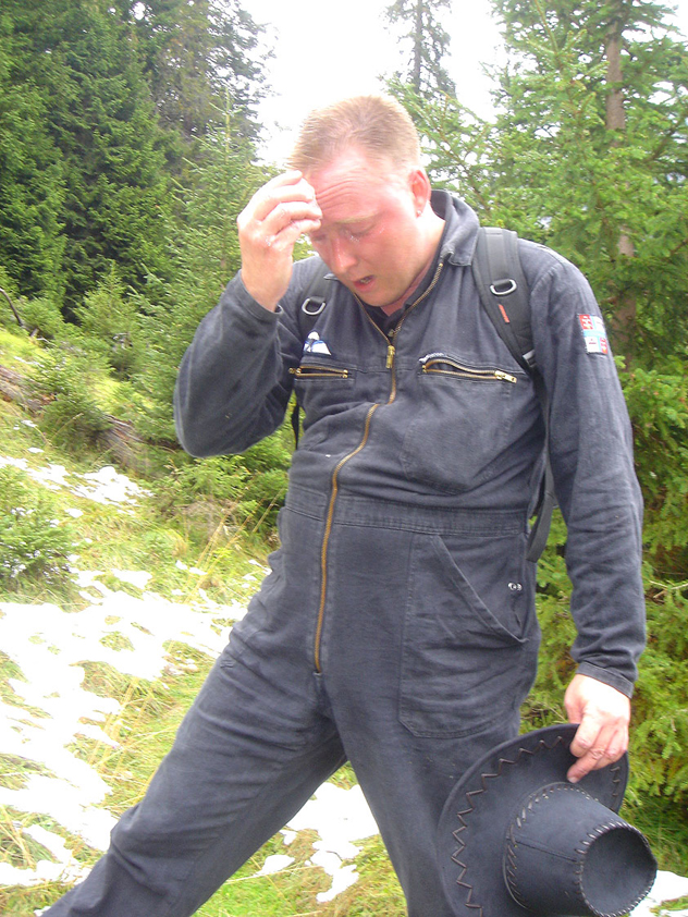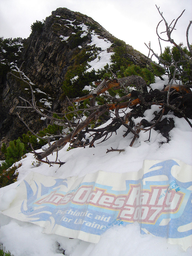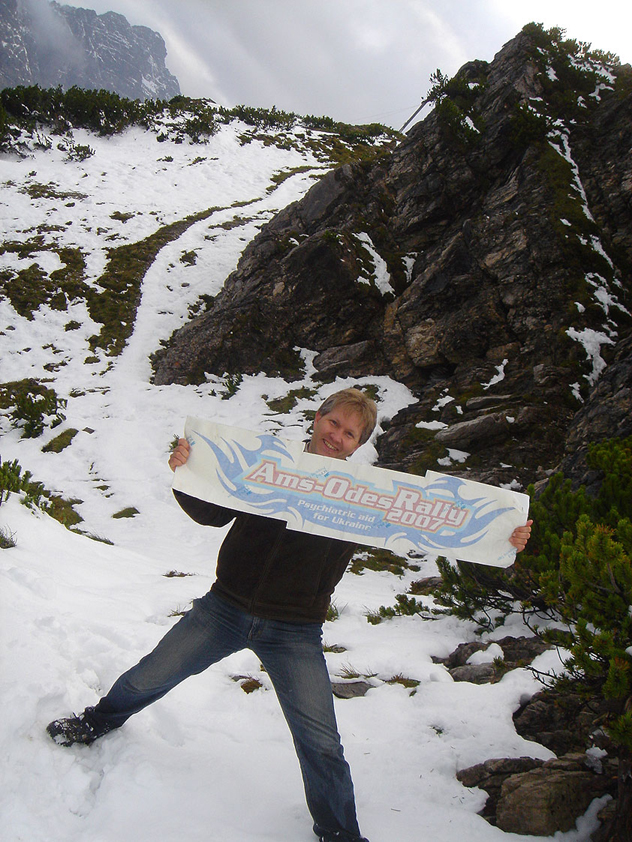 So, just below the summit, I decide to climb alongside the snow, over the rocks for a bit. Now, my indoor climbing course (once meant to become outdoor, but time and money didn't reach) comes to good use. "Climb with your feet", "never release your support before you are certain where the next one will be", "always hold three points" and "rest standing, in between", wise lessons they are. Still, I considerably damage myself, when my foot slips from the wet rock (my left hand's cut in four places, and bleeds profusely), and I lose the hat I bought in Costineşti. "We'll get that on the way down", the utterly irritated Ed calls from above. He's been cooling down for minutes, waiting above me. Logical, for him to be irritated. But, he doesn't share my weight and shoes. So, even when, angrily, he climbs down again and yells "Do I really have to show you how to?", then climbs away from me through the snow, I cannot follow him on that route. So I plod on. But I reach the top, and then try to fix my bleeding hands, with the first aid kit I took from my car and brought along. There's no bandaids in it! Damn. I stash it away again and open a bottle of dubious Odessian cognac. Even Ed has some. The alcohol glow helps, but still we don't go the final one hundred yards, to the cross on the summit. The path there namely slopes downward towards the abyss, and there's some 20 inches of snow on it. The alternative is to clamber across the mountain ridge to the cross, in the piercing wind, but Ed refuses to. Rightly so, to my mind: dusk is already upon us, I am soaking with sweat and wet from the snow, I'm shivering with cold in the icy wind, and my bleeding open wounds are hurting: not a good combination, high up in the Alps. We take some pictures, of the rallylogo-in-the-snow, and then call the retreat. I do swiftly pack a second stone, to place next to the other, that came from the same mountain top and has been in my bookcase for years now. Do I feel beat? Not in the least. You don't fuck around with mountains: it kills you. Enough is enough. And: was I really that tough, when I was 17, 18? I think so. I glance over my shoulder, at my blood in the snow on Grubach. "You made the necessary sacrifice - the mountain takes, before it gives", Paul Vos will tell me later, in Haarlem. I hope so. The mountain thankfully does not take my hat, since it is retrieved by Ed, with some difficulty (he now finally begins to understand what I just went through), as I'm still clambering down above him. The way back is at least as hazardous as the way up. The path has namely never been constructed, but has evolved, because so many people took it. And so it is most uneven, and full of roots, rocks, mountain streams and the like. And although I carry a maglite, it is of little help: it namely produces night-blindness. We each fall on our face at least five times before we're back down. And every time that happens can lead to great trouble for us. It's lesson 1, in trekking: the most dangerous thing that can happen to you is breaking a leg or spraining an ankle, then to have to wait for help to arrive. Thankfully, we do not lose our way, since that would increase danger exponentially.