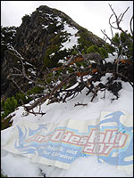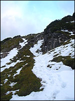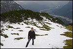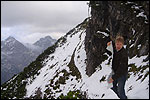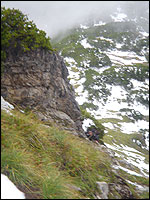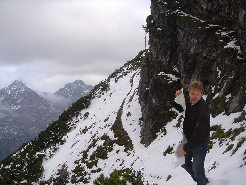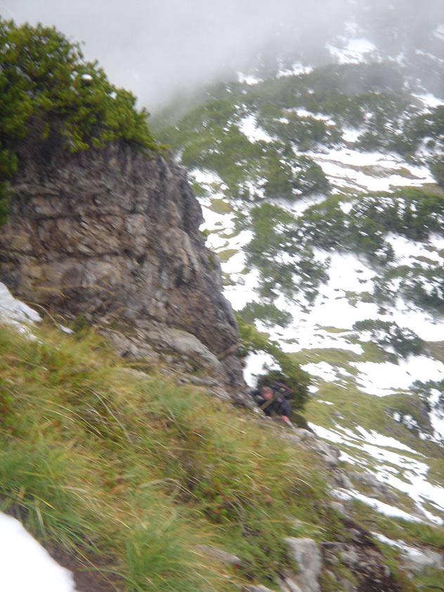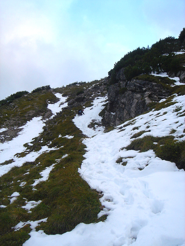 Well, that's true. But that world will take it out of me, more than expected, today. My mountaineering boots namely turn out to be insufficient. Their profile, due to long marches, is way too worn. At the treeline the going therefore becomes rough, when I accidentally stray from the path and pull myself up along an avalanche trail. I already have to hold the spruce bushes and pull my own considerable weight up, while Ed is waiting above (he has, as soon as he saw me plodding along, sought out the proper path instead, and found it too). Somewhat further up things get worse. There's a fresh pack of snow on Grubach! Normally, this mountain's too low for that, and given the current state of global warming, I would certainly not have expected it to be there. Back then, I stood on Grubach September 21st, on naked rock, in sunlight, under a clear blue sky. Now, it's only September 7th yet, it is white, and I'm climbing through clouds. Climbing, since I have so little grip, with my shoes, on the loose shingle and snow, that I slip away and downward. And I'm so heavy that, unlike Ed, I cannot clamp my feet down solidly in the snow, but slide down with it.