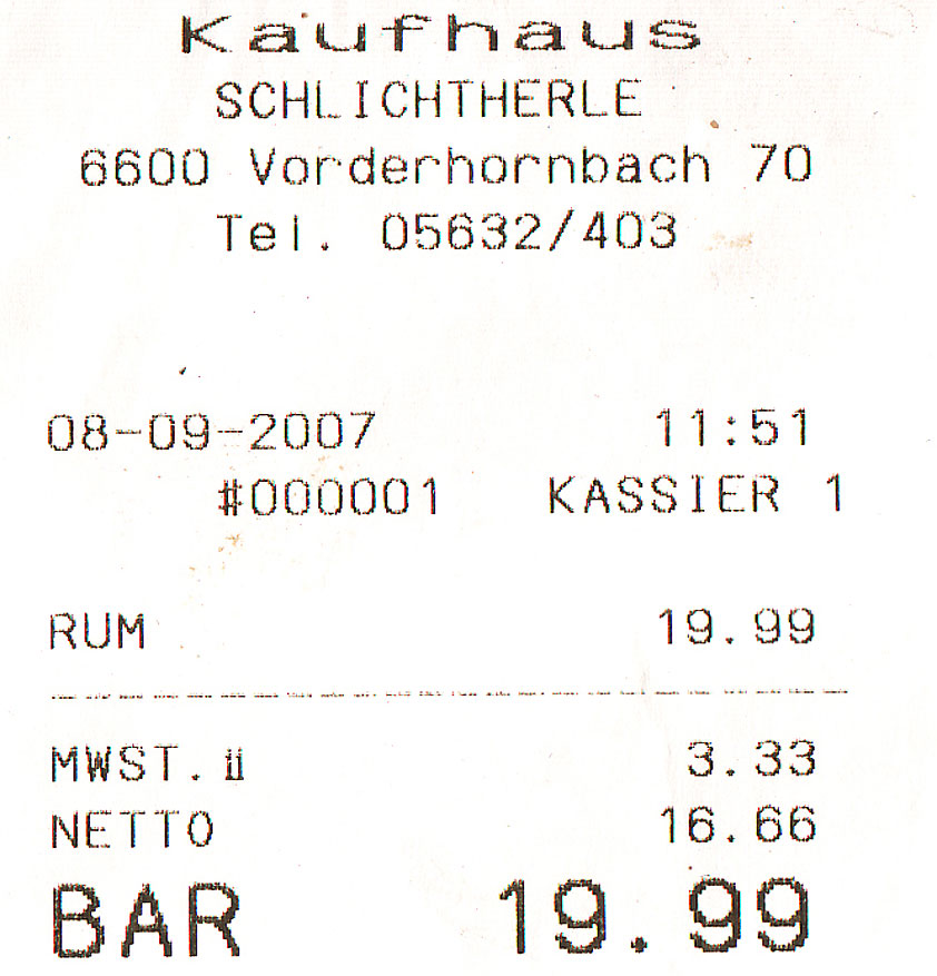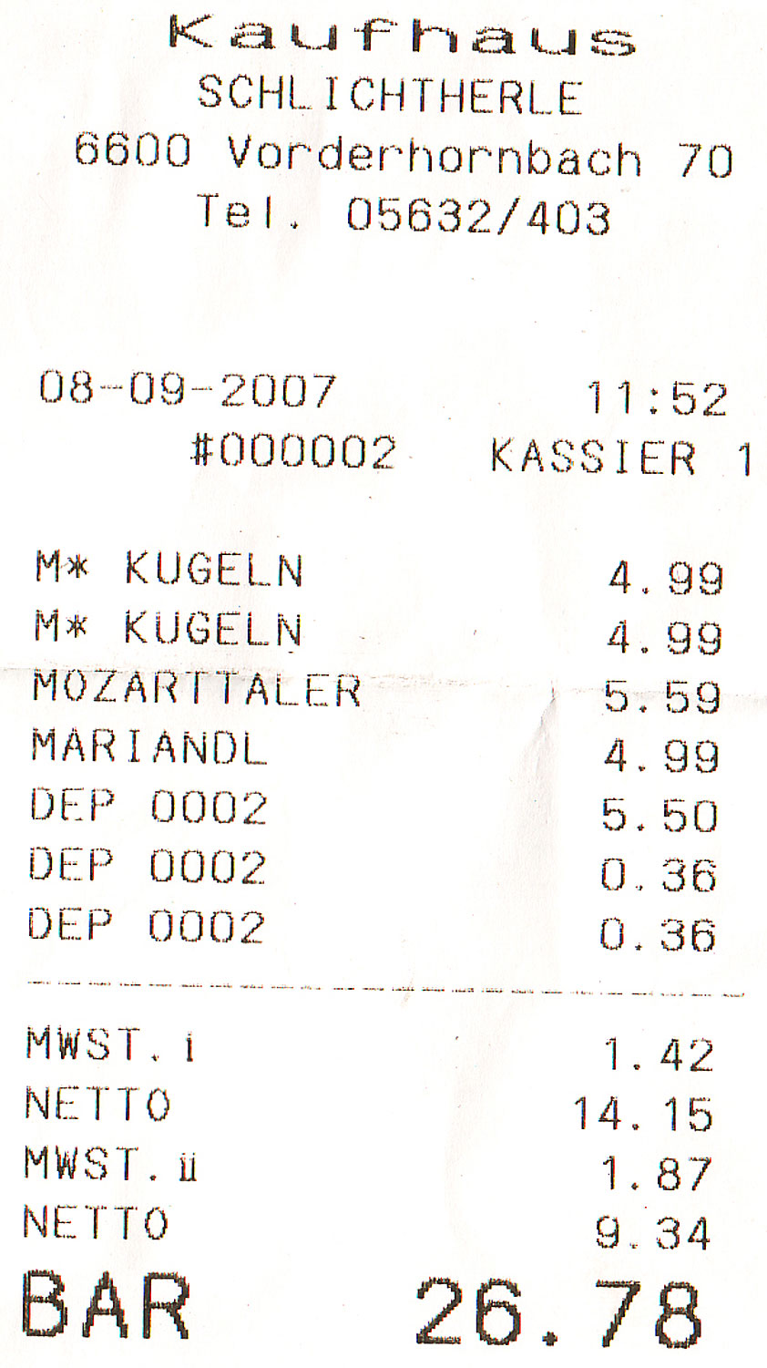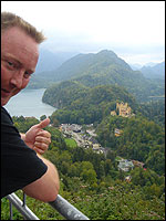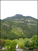 Day 16 09.08.2007: Vorderhornbach-Neuschwanstein-Solingen-Haarlem The next morning, we're late for breakfast. But we're forgiven, so get one anyway, and it is copious, with wonderful coffee. Then, hospitality increases. After breakfast, I walk to the supermarket, which turns out to have been closed half an hour ago. Not to worry. The innkeepster makes a call to the owner, a relative (a Schlichtherle too). He reopens the store, and we buy Strohrum (whilst I apologize for the shoplifting my HAVO-schoolmates did back then), a general map of the Lechtal, and (Ed) Mozartkügel. We take pictures of the Grubachspitze (the cross, a few yards high as it is, can hardly be made out, through the fog), from down below, and then we bid Gasthof Rose, and the innkeepster, farewell.