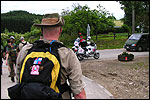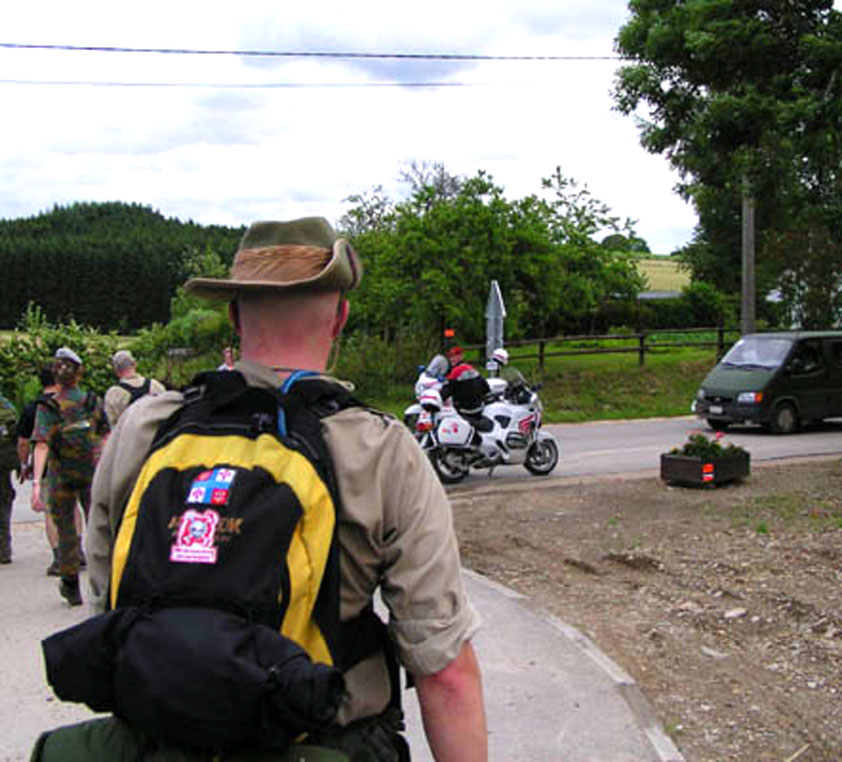 Wij, intussen, liepen onverstoorbaar de Ligne, op weg naar de grote rust in Hotton. Maar voor we daar kwamen werd ik, vanuit een berm, eerst nog plots besprongen door Tim, leider van het rustteam van de Herts and Bucks Wing, die in die berm op Steve en kornuiten lag te wachten, camera in de aanslag. Hij dirigeerde mij de hoek om, naar Elaine en haar verkwikkingen, waar ik bovendien werd voorgesteld aan de Wing Commander, Herts and Bucks, die met zijn vrouw een dag kwam kijken naar wat zijn troepen uitvoerden in het Belgische. Hij vond het een eer mij te ontmoeten, omdat hij van mijn eerdere MESA-verslagen had gehoord - maar ik vond dat de eer geheel aan mijn kant lag, en was bovendien blij met de extra aandacht vanuit de staf, voor het Marching Team, die mijn verslagen van Steve's inspanningen hadden opgeleverd. En wat ik hem dus vertelde was de waarheid: "You've a great team, walking out here". Ik zei het in mijn eerste verslag al, en er is in de voorbije vier jaar geen verandering in gekomen: dat land aan de andere kant van de plas kan zich weinig betere ambassadeurs wensen dan het Marching Team van de Herts and Bucks Wing. Bij de grote rust in Hotton liepen wij dan toch eindelijk Schelden weer tegen het lijf. Dat heuglijke feit zette ik kracht bij met een enorme scheldpartij in zijn richting (ik had me er de hele ochtend al op verheugd), die ik zo luidkeels op touw zette dat Jochem geschrokken vroeg of het niet wat zachter kon, omdat anders het hele veld het ging horen. Waarop ik breed grijnzend antwoordde dat dat nou precies mijn bedoeling was, en vrolijk doorschold. Woedend omdat-ie mij de schuld van zijn eigen drankprobleem gaf ("Je bent een wandelend drankprobleem dat niet eens meer wandelt!") met zijn bewering dat ik hem niet wakker had gemaakt ("DRIE keer! Ik heb je DRIE keer wakker geprobeerd te maken, GROTMONGOOL!") trok ik flink van leer tegen Schelden ("De commando's hebben me aan de ontbijttafel verteld dat ze mij meer waarderen dan jou, en toen heb ik ze gezegd dat ik ze net wilde gaan vertellen dat ik jou meer waardeer dan hun, en weet je? Dat neem ik terug! IK NEEM DAT TERUG!"). Dat luchtte lekker op, en dus vertrok ik daarna in opperbeste stemming richting de finish, in gezelschap van Max en Jochem. Uiteindelijk trok mijn eigen tempo weer wat aan, en kwam ik nog voor hen, maar in gezelschap van Peter en Marjan, aan bij de finish op Camp Roi Albert. Waarbij zich een flinke case weemoed aandiende, omdat Henk en ik, in 2000, zo prettig verblijf op dat kamp hadden gehad, en er sindsdien niet meer teruggeweest waren. Aan die finish namen wij de medailles en punaises in ontvangst (daar bleek overigens dat de medaille voor de Mini-MESA mooier is dan die van de 'gewone'), laafden wij ons tevreden aan de Jupiler, en namen wij de schade op, qua blaren. Ik had er twee, één op de linkerhiel, en één bovenop de rechter grote teen, en dat baarde mij zorgen, gezien de komende Castlebar. Maar, niets meer aan te doen, behalve schoonmaken en zoveel mogelijk rusten. Dat deed ik dus onmiddellijk, en daarmee viel ik van mijn geloof: want ik heb er een pesthekel aan direct na een mars terug te rijden naar huis, omdat je dan veel nafeesten mist.